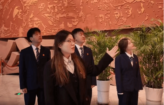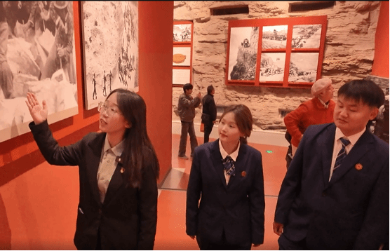 仪式结束后,在纪念馆工作人员的引导下有序参观了红旗渠纪念馆。马克思主义学院教师则带领学生代表穿梭于“千年旱魔,世代抗争”“红旗引领,创造奇迹”等展区,开展“行走的思政课”现场录制活动,以实景为课堂、以历史为教材,让红旗渠精神在镜头前焕发新的时代活力。在黑色炸药箱展品前,教师结合箱盖内壁的泛黄收据,讲述彭士俊等建设者“不贪占公物”的廉洁故事,解析修渠十年财务“正负零”的奇迹密码。面对展陈的粮款票据,“干部口粮标准低于民工”的细节讲解,让学生深切体悟党员干部与群众同甘共苦的作风。马克思主义学院院长刘琳娜表示:“我们希望通过镜头,让红旗渠精神跨越地域与时空,不仅成为我院学生的精神教材,也能为更多高校的思政教育提供生动素材,引导青年学子在新时代传承红色基因、勇担时代使命。”