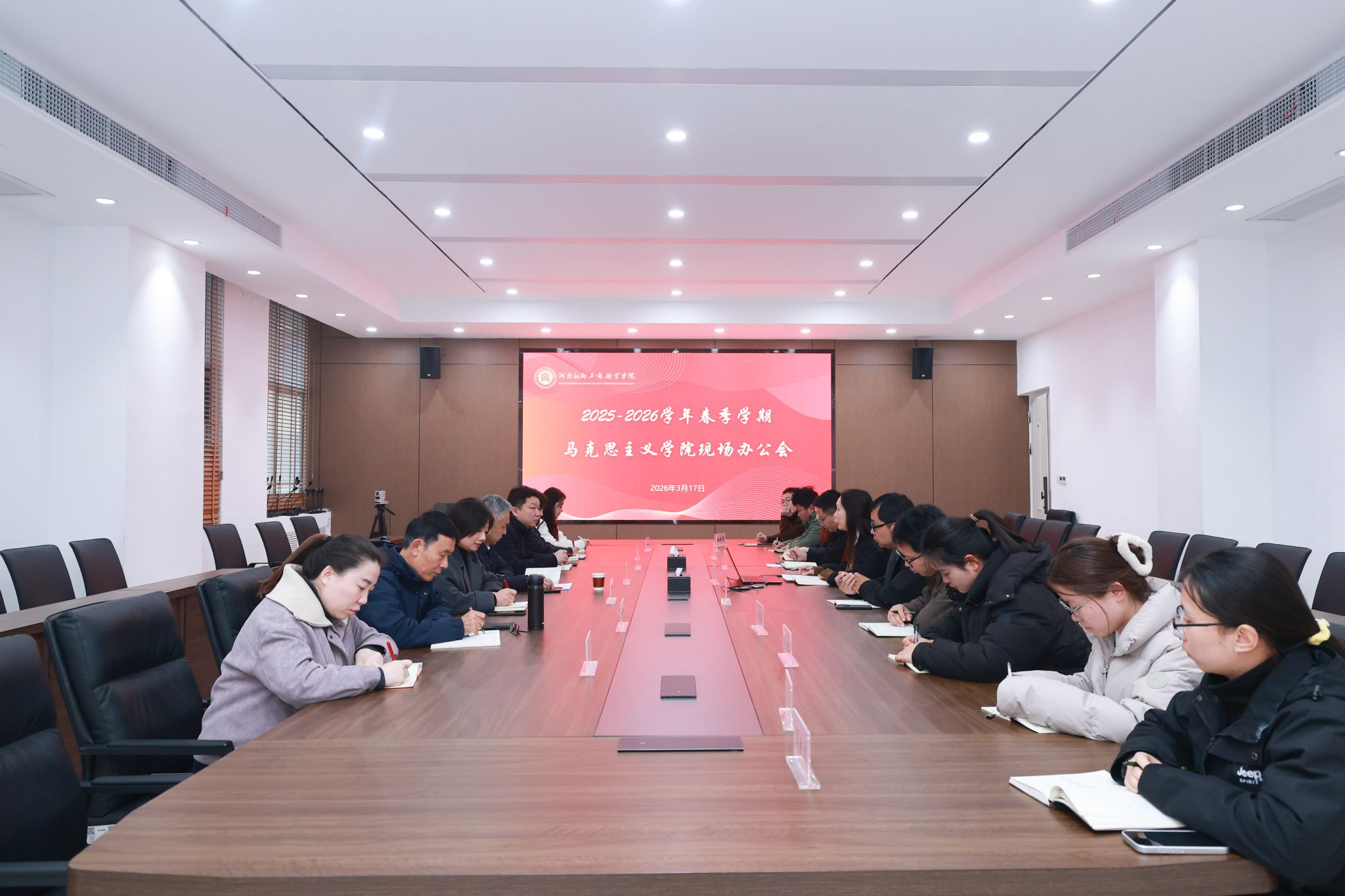 学校副校长石嘉、副校长刘文娟以及相关职能部门负责人出席会议,马克思主义学院院长刘琳娜及学院部分思政课教师参加会议。会议由马克思主义学院院长刘琳娜主持。会上,刘琳娜院长首先围绕学院2025年工作开展情况与2026年发展计划作详细汇报。随后,部分教师代表结合自身教学科研实际,就实践教学条件改善、课程资源建设、人才引育、经费保障等一线工作中遇到的问题提出意见建议。
